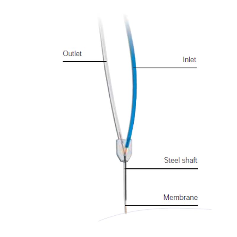An extremely small plastic body, where the inlet and outlet tubing are directly mounted, makes this probe easy to implant and light for a small animal to carry. A matching small and lightweight guide cannula is available.