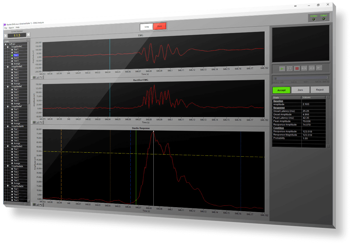 - Output popular, industry standard metrics of Electromyography with the press of a button – no configuration needed. Startle mode implements all gold standard techniques to quickly and easily identify valid trials and determine aggregate statistics: