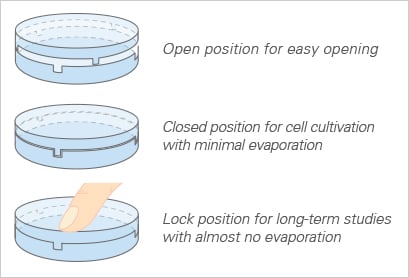 All ibidi µ-Dishes are equipped with the special lid-locking feature. The locking position minimizes evaporation, and thereby provides excellent conditions for long-term studies in a non-humidified environment. Gas exchange (carbon dioxide or oxygen) during cell culture is maintained thanks to the gas-permeable plastic material of the dish.