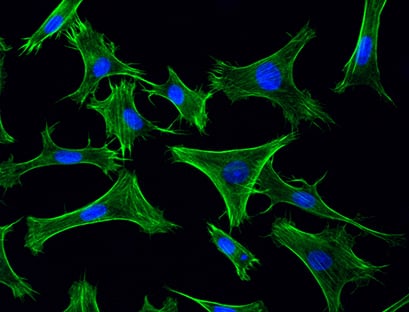 Fluorescence microscopy of fixed rat fibroblasts on a Glass Coverslip #1.5H. F-actin filaments are stained with phalloidin (green), nuclei are stained with DAPI (blue).