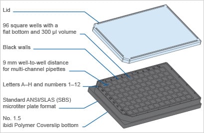 Ideal for cell microscopy due to black walls and optically clear flat bottomExcellent inner well flatness and whole plate flatnessLow well-to-well crosstalk in fluorescence microscopy.