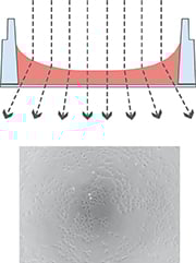 The illustration on the left shows the perturbing effect of a meniscus. Light is refracted on the air-water-interface, leading to poor contrast in microscopy. Only the small center part exhibits satisfying phase contrast.