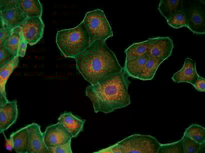 Fluorescence microscopy of MDCK cells. Mitochondria (MitoTracker, red), Actin cytoskeleton (Phalloidin, green), nuclei (DAPI, blue).