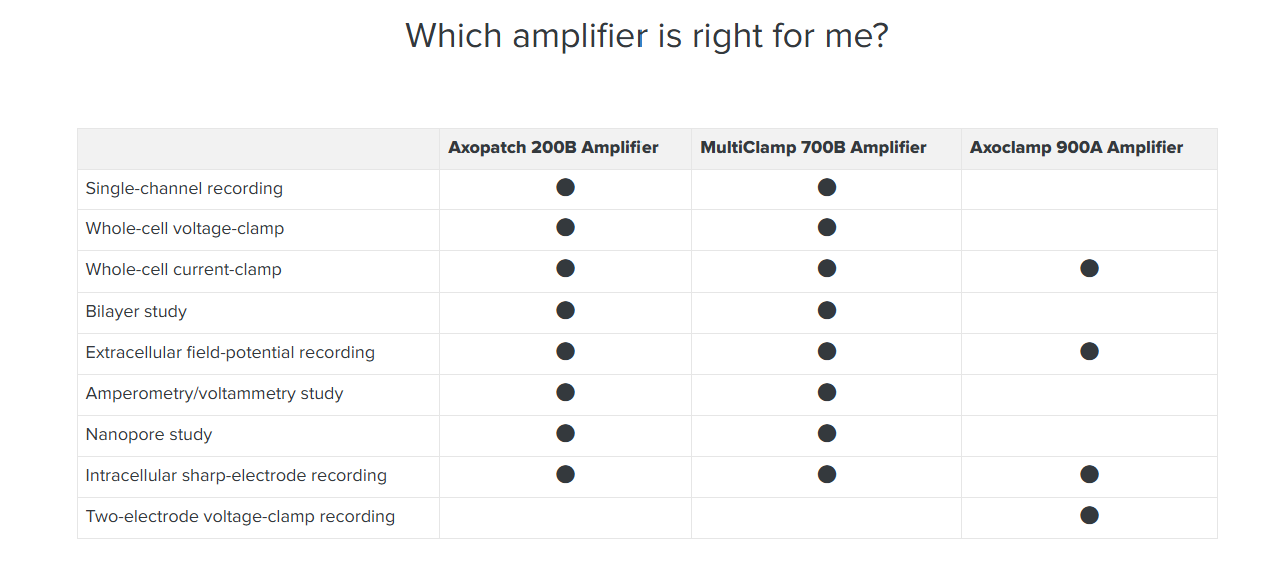 The Axon Instruments® series of amplifiers provide best-in-class solutions for the entire range of patch-clamp experiments. The portfolio of amplifiers includes Axopatch™ 200B for ultra low-noise single-channel recordings, MultiClamp™ 700B for whole-cell voltage-clamp and high-speed current-clamp recordings, and Axoclamp™ 900A for two-electrode voltage-clamp and current-clamp recordings.